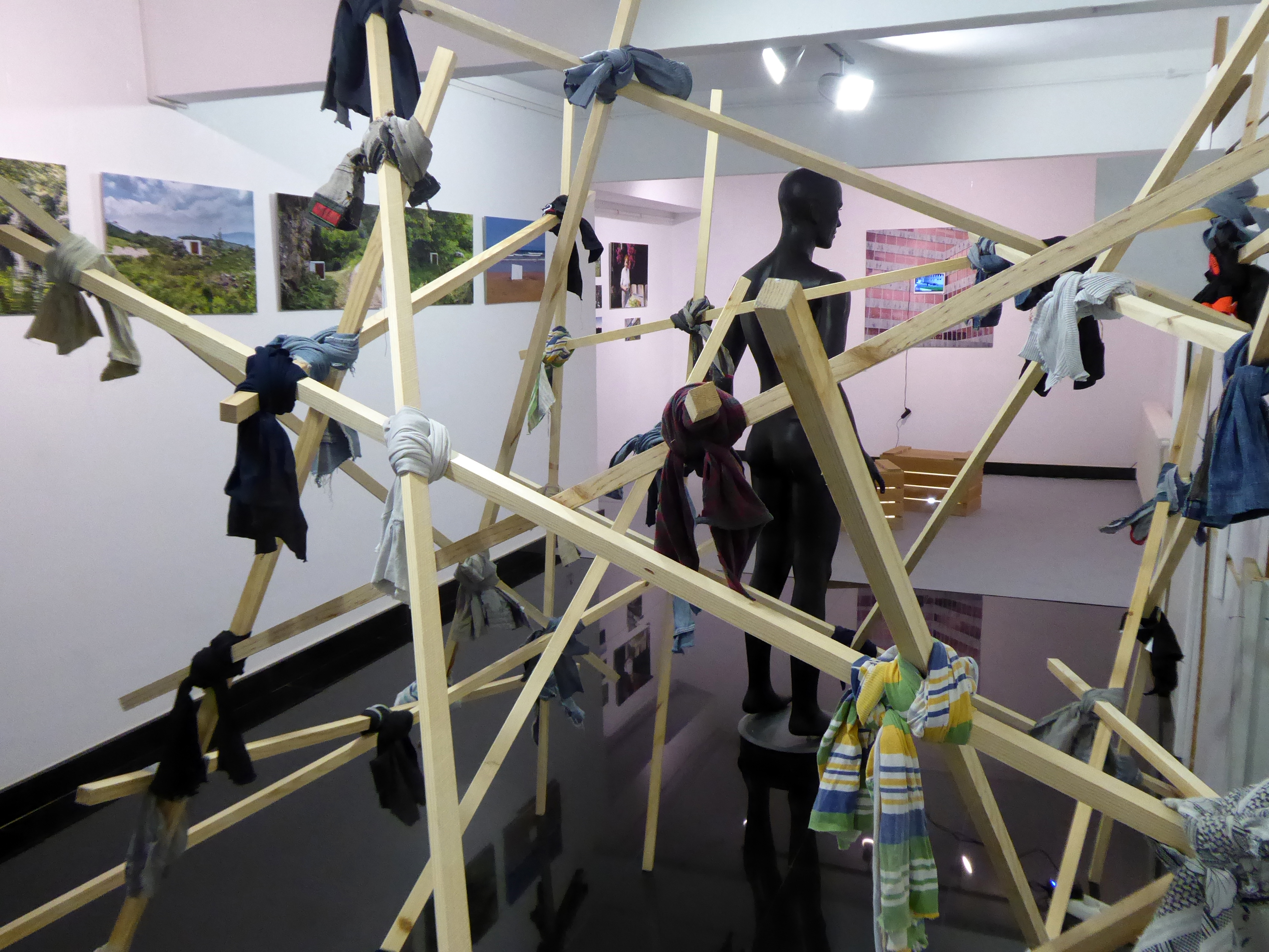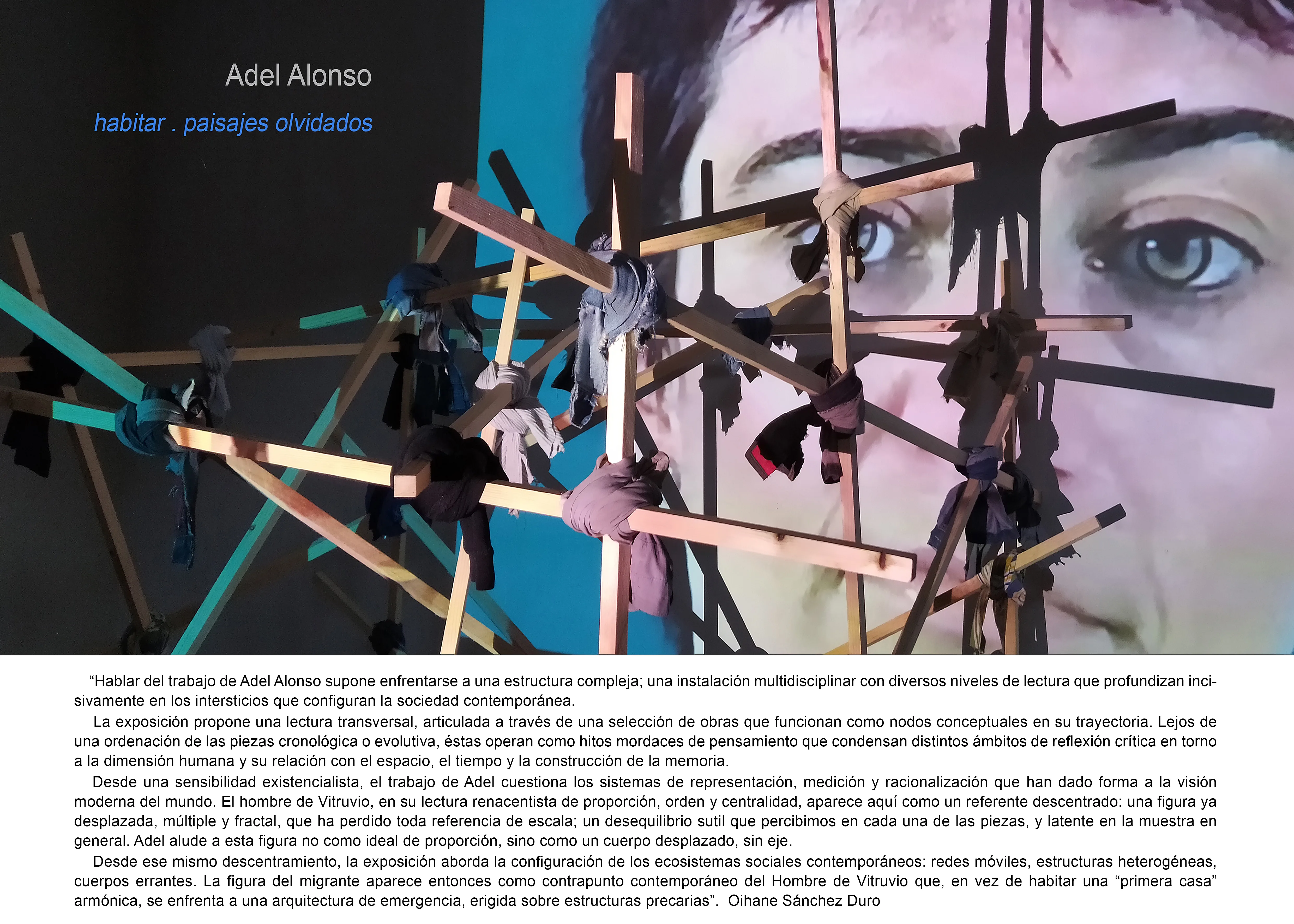 Desde ese mismo descentramiento, la exposición aborda la configuración de los ecosistemas sociales contemporáneos: redes móviles, estructuras heterogéneas, cuerpos errantes. La figura del migrante aparece entonces como contrapunto contemporáneo del Hombre de Vitruvio que, en vez de habitar una “primera casa” armónica, se enfrenta a una arquitectura de emergencia, erigida sobre estructuras precarias…Leer más